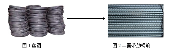 1、機(jī)組配置及性能簡(jiǎn)述 本機(jī)組是用于生產(chǎn)冷軋二面帶肋鋼筋的專(zhuān)用設(shè)備,該套生產(chǎn)線可將Φ6.5-Φ14mm的Q235熱軋盤(pán)圓鋼筋(圖1),冷軋制成兩面有月牙的帶肋鋼筋(圖2)。
