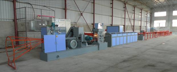 全套設(shè)備由放線架、整線籠、除鱗機(jī)、付軋機(jī)、主軋機(jī)、矯直、加熱、測(cè)溫、剪切、滑道、兩面接料、氣動(dòng)自動(dòng)推平、收線機(jī)等組成。機(jī)組按連續(xù)工作制設(shè)計(jì),整套設(shè)備由PLC系統(tǒng)控制。