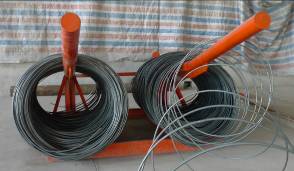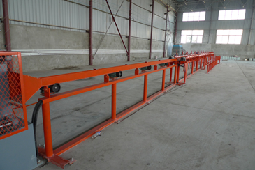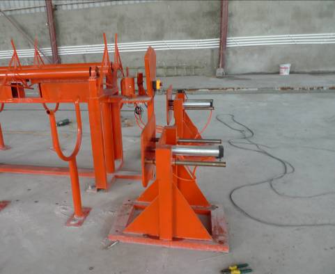 下面是各組成部分結(jié)構(gòu)及性能的簡(jiǎn)單描述: (1)放線架(見(jiàn)上總圖) 放線架的作用是保證該機(jī)組的高速運(yùn)行,其由雙放線炮管組成,一個(gè)是工作架,另一個(gè)是備儲(chǔ)架,當(dāng)一個(gè)在放線時(shí)可對(duì)另外一個(gè)炮管進(jìn)行預(yù)裝料。當(dāng)工作架上的盤(pán)圓放完時(shí),將該卷盤(pán)圓的尾端與另備儲(chǔ)架上盤(pán)圓的頭端對(duì)焊打磨后,可繼續(xù)開(kāi)機(jī),此時(shí)可對(duì)另一個(gè)放線架進(jìn)行預(yù)裝料,這種預(yù)裝料設(shè)計(jì)理念可提高因停機(jī)后裝料而降低工作效率。